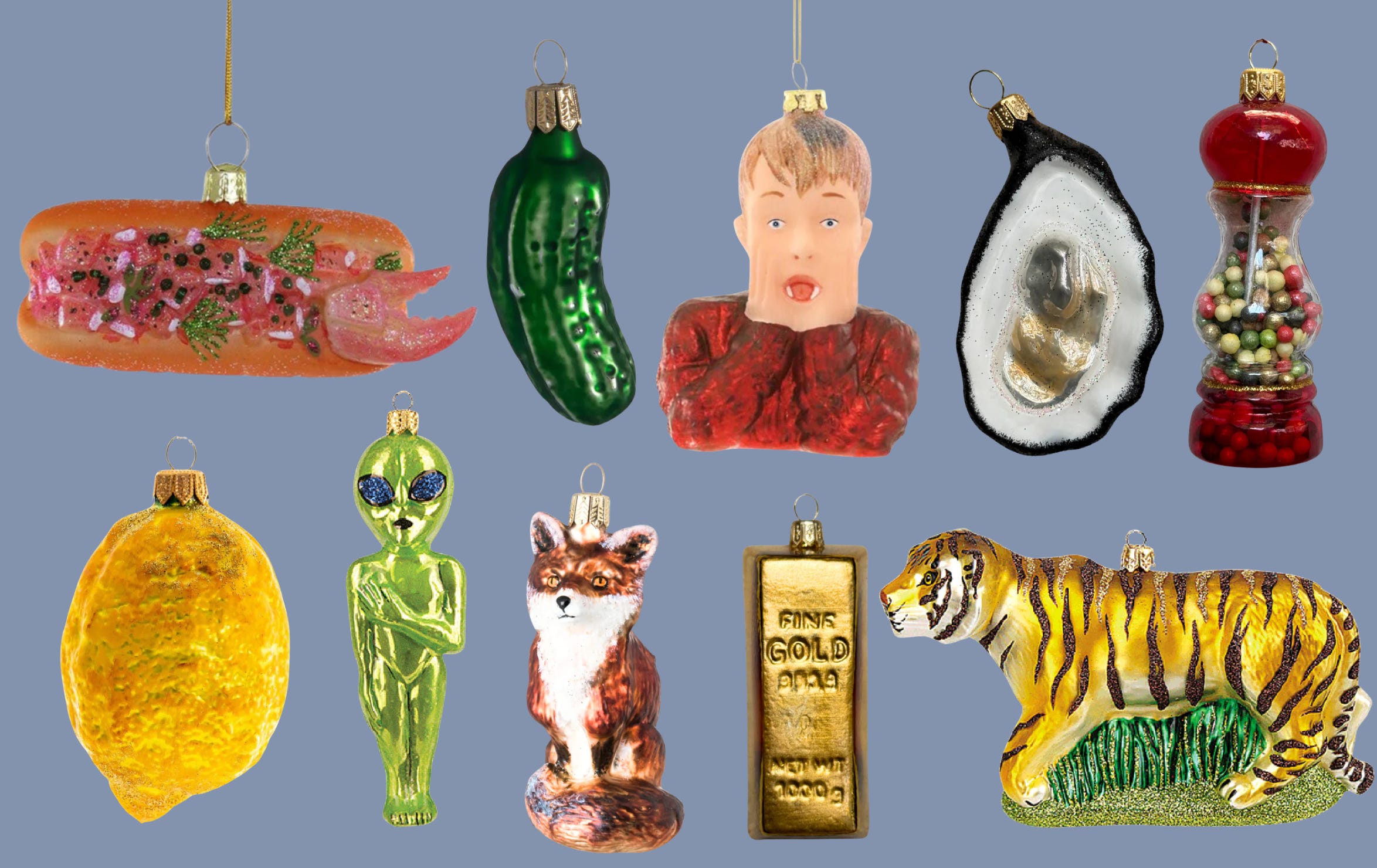 John Derian has an excellent assortment of ornaments. These look fantastic hanging off a stocking, and it’s fun to match the ornament to the person. Everything above is from John Derian, except The Kevin McAllister and Lobster Roll.
